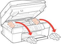 ![]() Hvis papiret sitter fast i nærheten av den bakre arkmateren eller utskriftsskuffen, fjerner du papiret forsiktig.