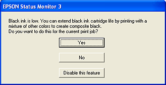 Klikk Disable this feature (Deaktiver denne funksjonen) hvis du vil fortsette å bruke det resterende svarte blekket. Vinduet vises ikke igjen før du skifter ut den svarte patronen.