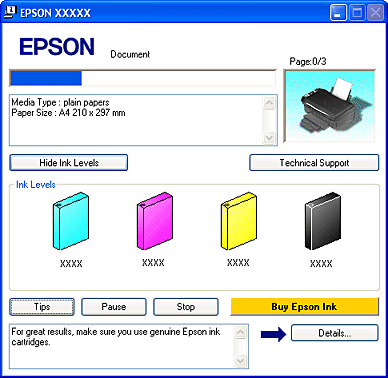 Progresjonsmåleren vises automatisk når du starter en utskriftsjobb. Du kan kontrollene statusen til blekkpatronene fra dette vinduet. Klikk på knappen Check Ink Levels (Kontroller blekknivåene) på skjermen med progresjonsmeteret, slik at du får vist statusen til blekkpatronene som illustrasjonen nedenfor viser.