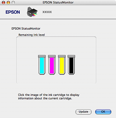 Illustrasjonen viser statusen til blekkpatronene da EPSON StatusMonitor ble åpnet. Hvis du vil oppdatere statusen til blekkpatronene, klikker du Update (Oppdater).