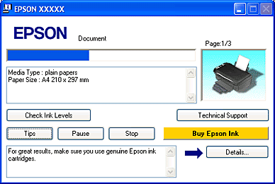 Tips!I tekstboksen i progresjonsmålervinduet vises det tips om hvordan du får best mulig utbytte av driveren for Epson-skriveren. Hvis du vil ha flere detaljer om tipset som vises i vinduet, velger du knappen Details (Detaljer).