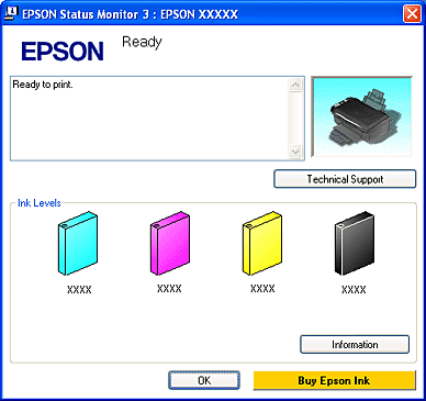 Du kan få tilgang til den elektroniske brukerhåndboken fra EPSON Status Monitor 3. Hvis det oppstår et problem, klikker du Technical Support (Kundestøtte) i vinduet EPSON Status Monitor 3. For Mac OS XBruke EPSON StatusMonitorHvis EPSON StatusMonitor finner en feil på skriveren, får du beskjed med en feilmelding.