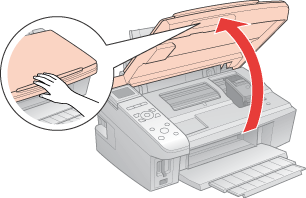 Skriveren står på en flat, stabil overflate som er større enn sokkelen i alle retninger. Skriveren vil ikke virke ordentlig hvis den står på skrå.