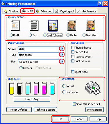 Klikk på kategorien Main (Hoved), og velg så en av de følgende innstillingene for Quality Option (Kvalitetsalternativ):