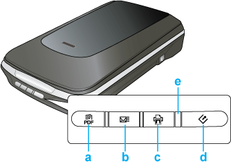Knappen Scan to PDF (Skanning til PDF)b. Knappen Scan to E-mail (Skanning til e-post)c. Knappen Copy (Kopi)d. Knappen Starte. Statuslampe LampeStatuslampen er plassert ved siden av