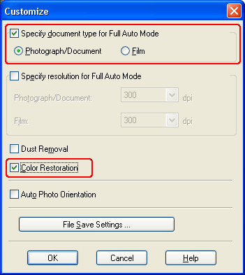 Full Auto Mode (Helautomatisk modus): Klikk knappen Customize (Tilpass), merk deretter av for alternativet Specify document type for Full Auto Mode (Angi dokumenttype for helautomatisk modus), og velg om nødvendig hvilken type original du skanner. Deretter merker du av for Color Restoration (Fargegjenoppretting) og klikker OK (OK). Gå videre til trinn 9.