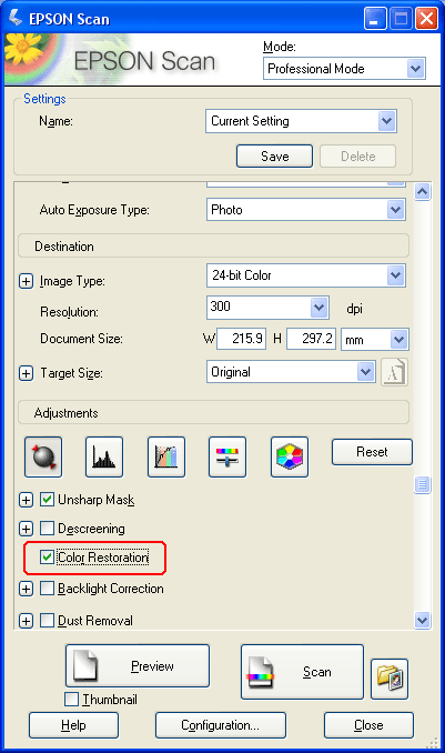 Følg disse trinnene for å gjenopprette farger ved hjelp av Epson Scan.