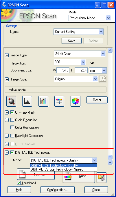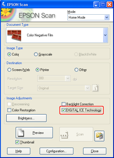 Skanneren og den tilhørende programvaren Epson Scan er utstyrt med funksjonene Digital ICE Technology og Digital ICE Lite Technology, som fjerner gjenstridige støv- eller skrapemerker fra fargefilmer eller slides.