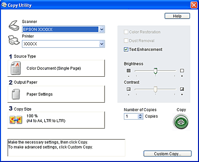Hvis du vil forhåndsvise skanningen før du skriver den ut eller velge flere kopieringsinnstillinger, klikker du knappen Custom Copy (Egendefinert kopiering) nederst i vinduet. Klikk Help (Hjelp) i Copy Utility for instruksjoner om hvordan du bruker funksjonen Custom Copy (Egendefinert kopiering).