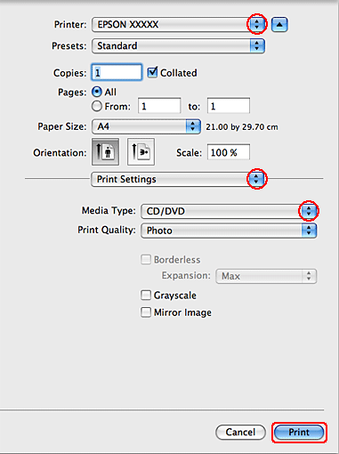 Når du skriver ut på CD/DVD med en kommersielt tilgjengelig programvarepakke som støtter CD-/DVD-utskrift, må du foreta følgende innstillinger.