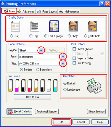 Velg passende innstillinger for Paper Size (Papirstørrelse) og Orientation (Papirretning). Du kan også lage en egendefinert papirstørrelse. Se den elektroniske hjelpen hvis du vil vite mer.