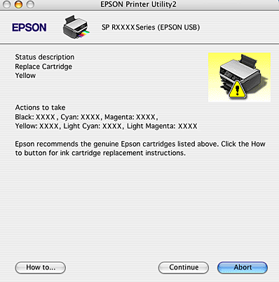 ![]() Knappen How to (Slik) vises hvis det er lite blekk igjen eller patronen er oppbrukt. Klikk How to (Slik) for å åpne EPSON StatusMonitor, der du vil få en trinnvis veiledning i hvordan du skifter ut blekkpatronen.
