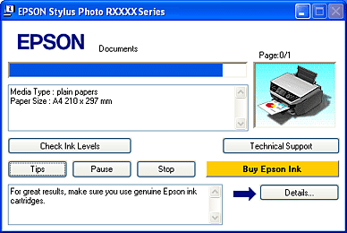 Tips (Tips!)I tekstboksen i progresjonsmålervinduet vises det tips om hvordan du får best mulig utbytte av driveren for Epson-skriveren. Det vises et nytt tips hvert 15. sekund. Vil du vite mer om tipset som vises i vinduet, klikker du Details (Detaljer).