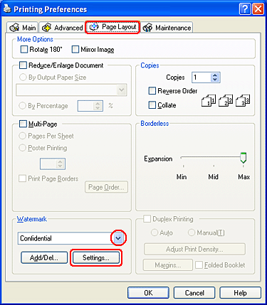Klikk Add/Del (Legg til/Slett) under Watermark (Vannmerke) i vinduet Page Layout (Sidelayout). Følgende vindu vises.