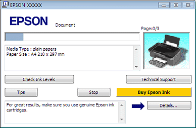 Tips (Tips!)I tekstboksen i progresjonsmålervinduet vises det forskjellige tips om hvordan du får best mulig utbytte av driveren for Epson-skriveren. Hvis du vil ha flere detaljer om tipset som vises i vinduet, velger du knappen Details (Detaljer).
