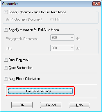 Klikk knappen Scan (Skann). Vinduet File Save Settings (Innstillinger for fillagring) vises.