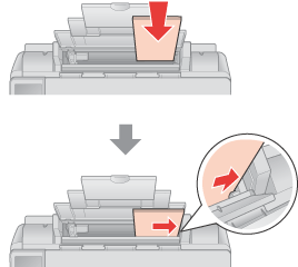 Skyv kantskinnen mot venstre papirkant, men ikke for tett. Pass på at papiret får plass under pilmerket på innsiden av kantskinnen.