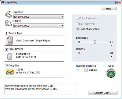 Hvis du vil forhåndsvise skanningen før du skriver den ut eller velge flere kopieringsinnstillinger, klikker du Custom Copy (Egendefinert kopiering) nederst i vinduet. Klikk Help (Hjelp) i Copy Utility (Kopiering) for instruksjoner om hvordan du bruker funksjonen Custom Copy (Egendefinert kopiering).
