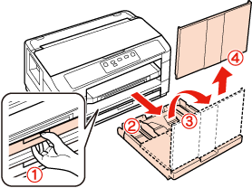 Hvis utskriftsskuffen er blitt løst ut, lukker du den før du trekker ut papirkassetten.