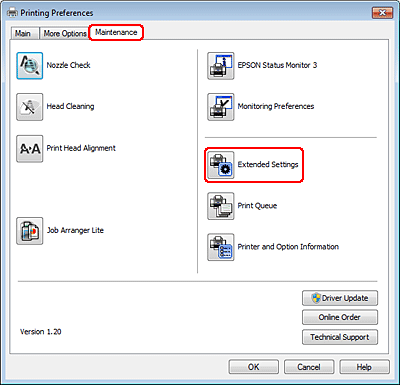 Zbyt niską prędkość drukowania można zwiększyć, wybierając odpowiednie ustawienia w oknie Extended Settings (Ustawienia zaawansowane). Kliknąć przycisk Extended Settings (Ustawienia zaawansowane) w oknie Maintenance (Konserwacja) sterownika drukarki.