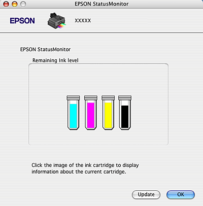Wyświetlony zostanie stan pojemnika z tuszem, jaki został zapisany przy pierwszym otwarciu okna EPSON StatusMonitor. Aby zaktualizować informacje o poziomie tuszu, należy kliknąć przycisk Update (Aktualizuj).