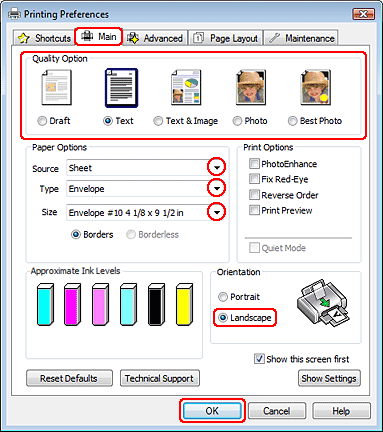 Kliknij kartę Main (Główne), a następnie wybierz jedno z następujących ustawień opcji Quality Option (Typ jakości):