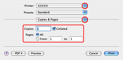 Wybierz używaną drukarkę w ustawieniu Printer (Drukarka). Następnie wybierz odpowiednie ustawienie opcji Copies & Pages (Kopie i strony).