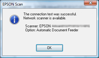 Sprawdź, czy pojawił się komunikat The connection test was successful (Test połączenia ukończony) i czy wyświetlona jest nazwa skanera, a następnie kliknij OK.