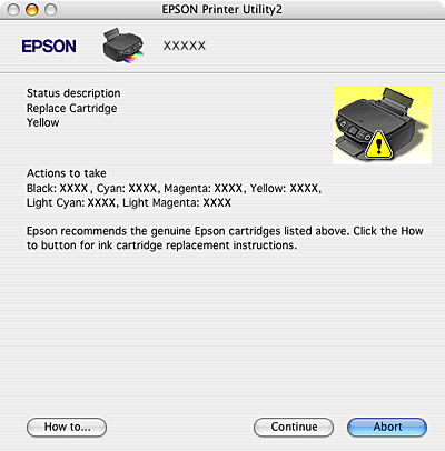 ![]() W przypadku niskiego poziomu tuszu lub po jego wyczerpaniu pojawi się przycisk How to (Jak). Kliknij How to (Jak), EPSON StatusMonitor poprowadzi cię krok po kroku przez procedurę wymiany pojemnika z tuszem.