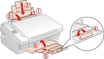Złóż osłonę podajnika, następnie zamknij podpórkę papieru i tacę wyjściową.