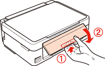 Przełożyć prowadnicę podajnika do przodu, zamknąć podpórkę papieru, a następnie przełożyć prowadnicę podajnika do tyłu i zamknąć tackę wyjściową.