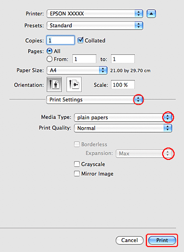 W zależności od programu wybór niektórych elementów z okna dialogowego może być niemożliwy. W takim przypadku kliknij pozycję Page Setup (Ustawienia strony) w menu File (Plik) aplikacji i określ odpowiednie ustawienia.