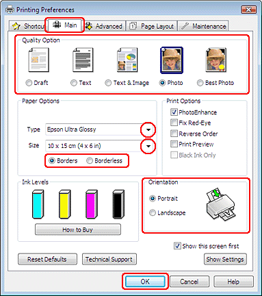 Faça clique no separador Main (Principal) e, em seguida, seleccione uma das seguintes Quality Option (Opções de qualidade):