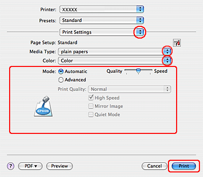 Seleccione as definições Media Type (Papel), Color (Cor) e Mode (Modo) adequadas. Para mais informações sobre as Print Settings (Definições de Impressão), consulte a ajuda interactiva.