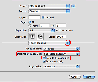 Esta é uma função padrão do Mac OS X 10.4. Para utilizar esta função, seleccione um formato de papel padrão (por exemplo, A4) como definição Paper Size (Formato) e seleccione uma Scale (Escala) de acordo com a definição de formato. Não seleccione um formato de papel com uma opção de configuração de página como, por exemplo, Sheet Feeder - Borderless (Alimentador Automático - Sem Margens). Esta função não está disponível em Mac OS X 10.3.