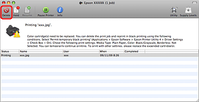 Se não for possível retomar a impressão, clique no ícone da impressora na Dock. Se for apresentada uma mensagem de erro a solicitar que cancele a tarefa de impressão, clique em Delete (Apagar) e efectue as operações indicadas abaixo para voltar a imprimir o documento com tinta preta.