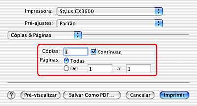 Seleccione Stylus CX3600 para a definição Impressora e, em seguida, efectue as definições Cópias & Páginas.