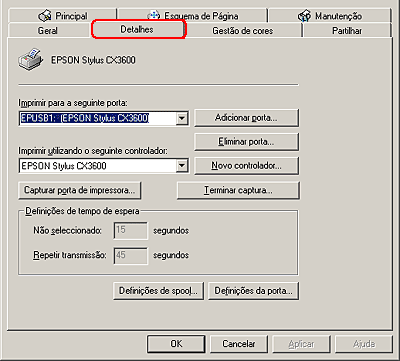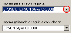 Se EPUSBX: (EPSON Stylus CX3600) aparecer na caixa Imprimir para a seguinte porta, isso significa que o software da impressora e o controlador de impressão USB estão instalados correctamente. Se não aparecer a porta correcta, avance para o ponto seguinte.