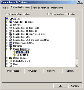 Por baixo de Outros dispositivos, seleccione USB MFP ou EPSON Stylus CX3600 e faça clique em Remover. Em seguida, faça clique em OK.