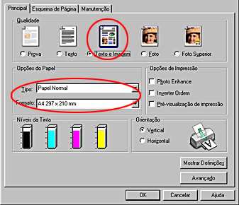 Faça clique no separador Principal, seleccione Papel Normal e A4 para as Opções do Papel. Seleccione a opção Texto e Imagem para a definição Qualidade.