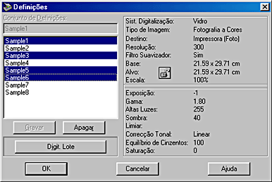 Para digitalizar uma única imagem utilizando diferentes conjuntos de definições, efectue e guarde cada grupo de definições da forma descrita anteriormente. Em seguida, mantenha a tecla Crtl do teclado pressionada enquanto faz clique nas definições personalizadas que pretende seleccionar na lista Conjunto de Definições. Depois de seleccionar todas as definições que pretende utilizar durante a digitalização, faça clique em Digit. Lote. O produto digitaliza a imagem uma vez por cada grupo de definições que tiver seleccionado.