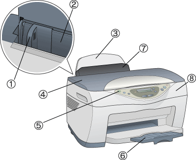 3. Suporte de papel: Suporta o papel colocado no alimentador.
