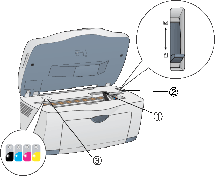 2. Alavanca de ajuste: Permite ajustar a distância entre a cabeça de impressão e o papel para evitar esborratar o documento. Quando imprimir em papel espesso ou envelopes, e a tinta esborratar o documento, coloque a alavanca na posição