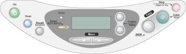 Permite parar o processo de cópia e cancelar a impressão. A folha que está a ser copiada e impressa é ejectada Regressa ao modo de visualização normal quando aparecer um item de menu no painel LCD. |