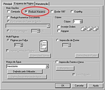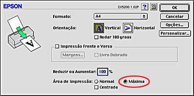 Se ampliar a área de impressão activando a opção Reduzir Margens em Mais Opções (Windows) ou seleccionando a área de impressão Máxima (Macintosh) no controlador da impressora, o canto cortado no papel especial pode prejudicar o resultado de impressão.