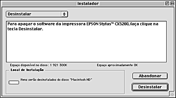 Se utilizar a porta USB para ligar o equipamento em Windows Me ou 98, necessita de desinstalar um componente USB adicional. Seleccione a opção de dispositivos da impressora USB EPSON na lista do utilitário Adicionar/Remover Programas, faça clique na tecla Adicionar/Remover e, em seguida, faça clique em OK quando aparecer uma mensagem a pedir para reiniciar o computador. Se a opção de dispositivos da impressora USB EPSON não aparecer na lista Adicionar/Remover Programas, faça clique duas vezes em EPUSBUN.EXE no CD-ROM do software da impressora e siga as instruções apresentadas no ecrã.-