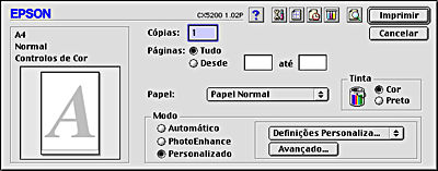 Seleccione o modo Personalizado na caixa de diálogo Imprimir e, em seguida, faça clique na tecla Avançado. Aparece a caixa de diálogo Avançado.