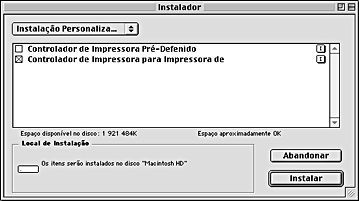 Seleccione Instalação Personalizada no instalador e seleccione a caixa de verificação relativa ao pacote do controlador da impressora para impressão a partir do ambiente de trabalho .