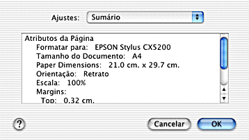 Na caixa de diálogo de configuração da página, com a opção Sumário seleccionada para o parâmetro Ajustes, pode confirmar as definições actuais.
