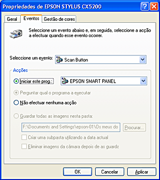 que não o EPSON Smart Panel, que suporte os eventos do digitalizador (por exemplo, o Imaging for Windows, desde que esteja instalado) em Windows. Ao pressionar o botão Digitalizar